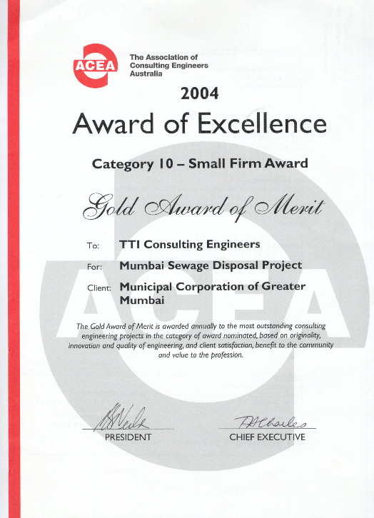 TTI Consulting Engineers is an ISO 9001:2015 company certified by International Certification & Inspection UK Limited (ICI UK) and world’s leading consulting firm in the field of infrastructure development.TTI Consulting Engineers Provides one stop Engineering Services to Major Municipal and Water Authorities since 1995 and also Won “Gold Award of Merit and Award of Excellence” from the Association of Consulting Engineers, Australia (ACEA)” for Outstanding Performance, Innovation and Quality Engineering Services offered to the Municipal Corporation of Greater Mumbai for the implementation of World Bank funded Trenchless Sewer Rehabilitation works in 1999-2003.